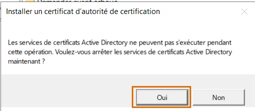 Validez ensuite le message d’avertissement indiquant que le service de certification sera temporairement arrêté le temps du renouvellement.