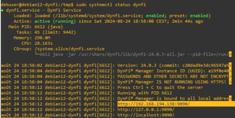 Vérifiez le statut du service DynFi pour vous assurer qu'il fonctionne correctement :
