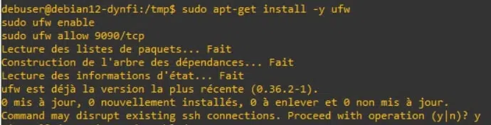 Par défaut, tous les flux sont autorisés sur la machine Debian. Pour des raisons de sécurité, il est préférable d'installer un outil pour configurer le pare-feu local. Dans ce cas, il faudra ouvrir le port 9090 pour accéder à l'interface de Dynfi (et autorisez d'autres ports, si besoin). J'ai choisi d'installer UFW comme pare-feu :