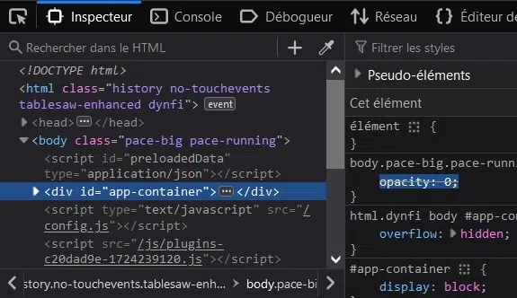 Si le temps de chargement est trop long, vous pouvez inspecter la page, trouver la div nommée " id="app-container" " et modifier le style "opacity" à "0". Pour faire disparaître la barre de chargement, cliquez avec le bouton droit sur "<div class="pace pace-active">" et supprimez le nœud.