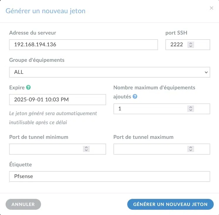 Entrez l'adresse IP de votre pare-feu, laissez le port par défaut 2222, ajoutez une étiquette (par exemple, "pfSense"), définissez une date d'expiration (1 an par exemple), puis cliquez sur "Générer" et fermez.