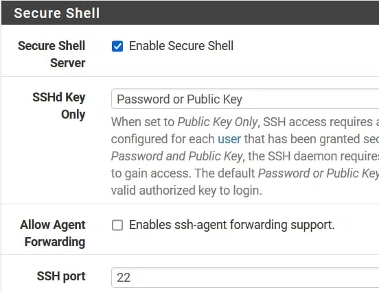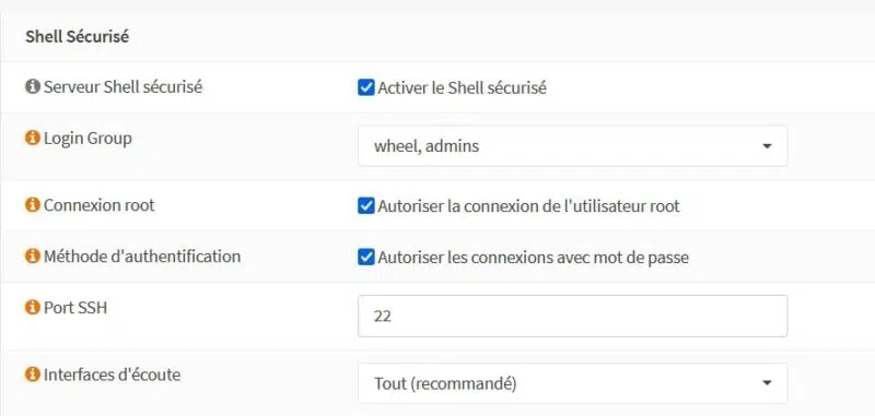Rechargez la page. Si tout s'est bien passé, vous verrez un nouvel élément "DynFi Connection Agent" apparaître dans le menu "Services". Avant de l'utiliser, rendez-vous dans "System", puis "Advanced", et descendez jusqu'à la section "Secure Shell" pour cocher la case "Enable Secure Shell", puis sauvegardez.
