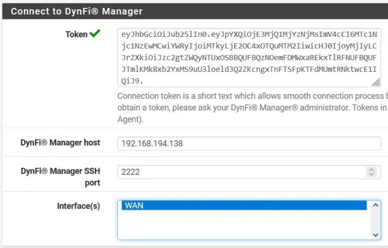 Sur DynFi, récupérez le token généré précédemment, revenez sur pfSense, collez le token, indiquez l'adresse IP de votre DynFi, et si besoin, sélectionnez une interface spécifique (interface d'écoute du service).