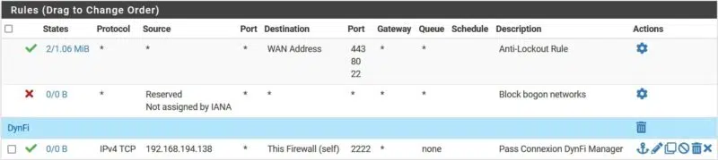 Si vous êtes bloqué, vérifiez vos règles WAN, LAN, IPSEC qui pourraient être bloquantes. Vous pouvez, par exemple, ajouter une règle de pare-feu sur pfSense pour autoriser spécifiquement DynFi.