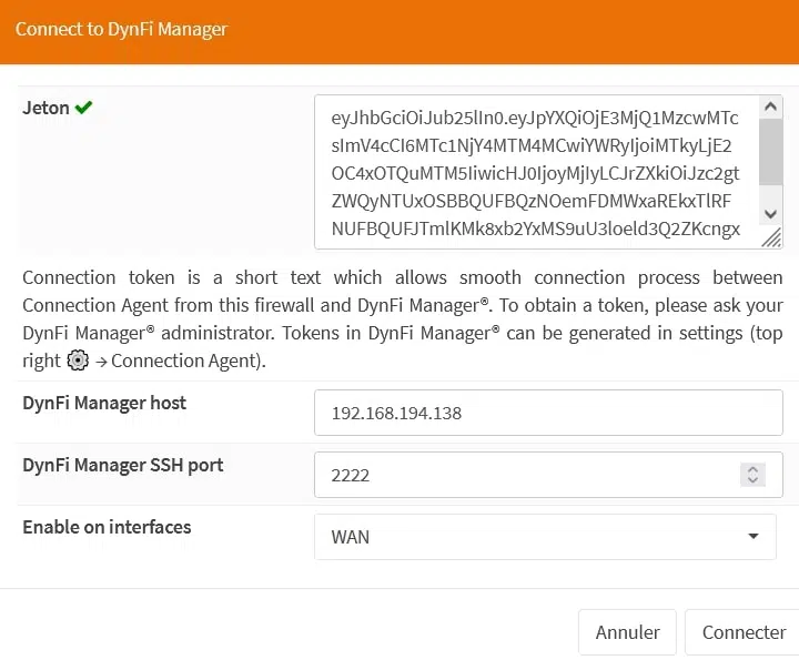 Maintenant, allez dans "DynFi Connection Agent", cliquez sur "Connecter", et entrez le token généré précédemment dans DynFi Manager.