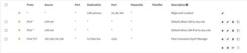 - Destination Port Range : 2222 (ou le port que vous avez configuré dans DynFi)