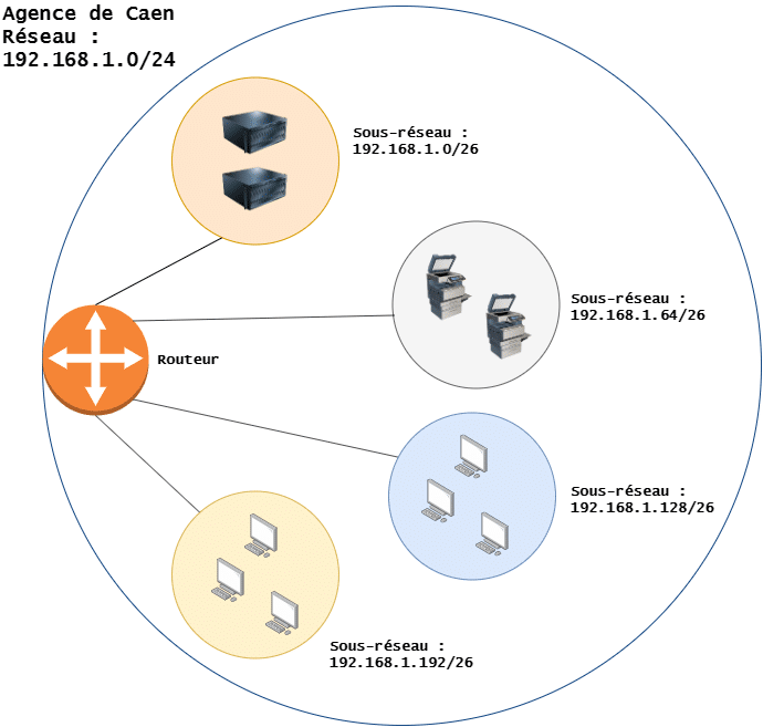 Si l'on schématise ces sous-réseaux sur un réseau, cela pourrait permettre de découper notre réseau en plusieurs VLANs. Par exemple, un sous-réseau pour les serveurs, un autre pour les imprimantes et copieurs, un pour les machines internes et un pour les machines des visiteurs.