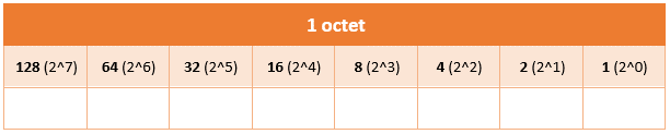 Nous savons qu'un octet est égal à 8 bits et que chaque bit est une puissance de deux, en commençant par "2 puissance 0" qui est égal à 1, "2 puissance 1" qui est égal à 2, etc... Ce qui donne le tableau suivant :
