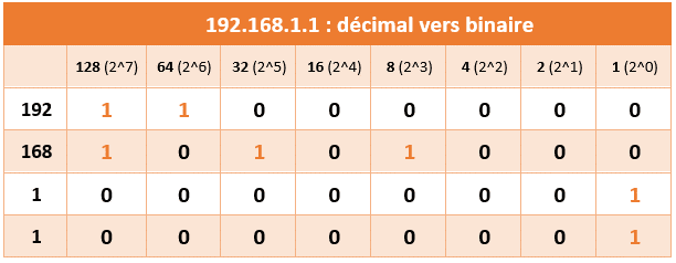 Si l'on écrit sur une seule ligne, 192.168.1.1 en notation binaire, cela donne :