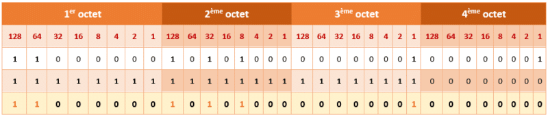 Nous allons faire le même travail avec le masque de sous-réseau et le convertir en binaire. Sur le même principe, voici le résultat :