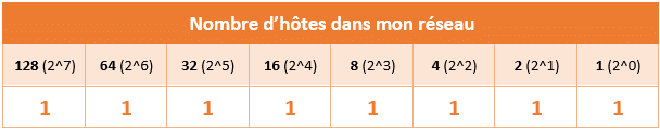 Cela revient à prendre "00000000", à inverser les valeurs, ce qui va donner tout simplement "11111111" puis à convertir la valeur binaire en décimale. Reprenons notre tableau :