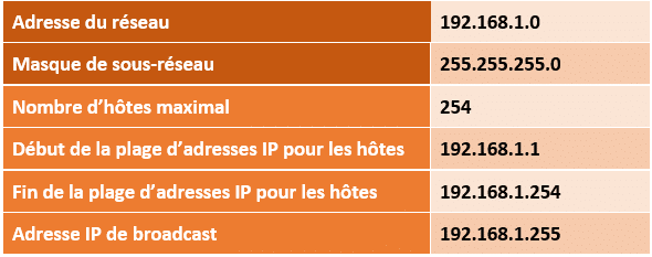 En résumé, on peut considérer que la plage d'adresses IP que l'on peut attribuer à nos hôtes (routeur, ordinateurs, smartphones, etc.) est la suivante : 192.168.1.1 à 192.168.1.254. Soit un total de 254 adresses IP, non 255 ni 256. Pour finir, on peut établir une synthèse de notre réseau :