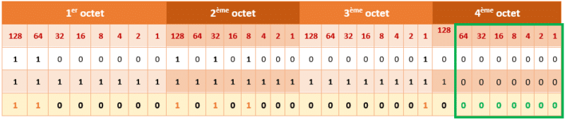 ➡ Sur la quatrième ligne du tableau, la conversion en binaire du masque de sous-réseau