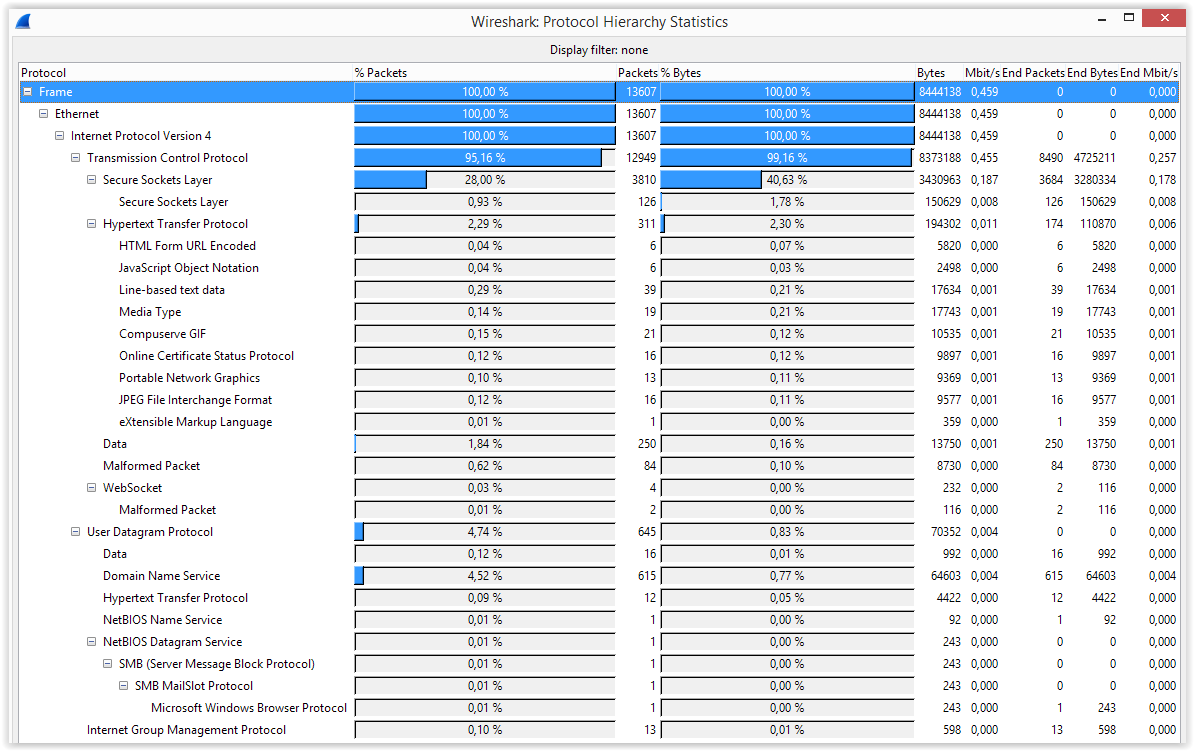 Dans cette capture que j'ai choisi en exemple, on peut voir que 28% des paquets transportaient un protocole chiffré via SSL (Secure Socket Layer) et 2.29% transportaient le protocole HTTP. On trouvera également une répartition par protocole de transport (95.16% de TCP et 4.74% d'UDP dans l'exemple ci-dessus), on pourra même descendre dans le modèle TCP/IP pour voir le pourcentage de trames en IPv4 IPv6, etc.