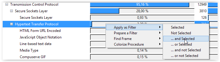 Une petite note sur la différence entre "Apply as Filter" et "Prepare a Filter" . Le premier choix va directement appliquer le filtre sur le protocole que nous sélectionnons alors que le second va permettre de construire des filtrages plus complexes avec des "and" et des "or" :