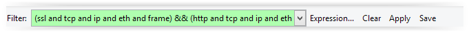 Par exemple pour obtenir le filtre suivant, j'ai d'abord fait un "Prepare a Filter" puis "Selected" sur le protocole SSL, puis j'ai fait un "Apply a Filter" sur le protocole HTTP.Dans un premier temps, ne vous souciez pas trop de cette différence, les deux options sont très similaires.