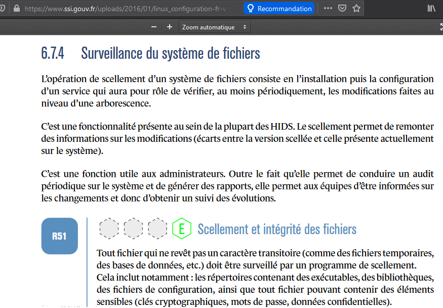 L'implémentation d'une solution de scellement est une recommandation émise notamment par l'ANSSI dans son guide Recommandations pour la configuration d'un système GNU/Linux (Recommandation 51, page 62) :