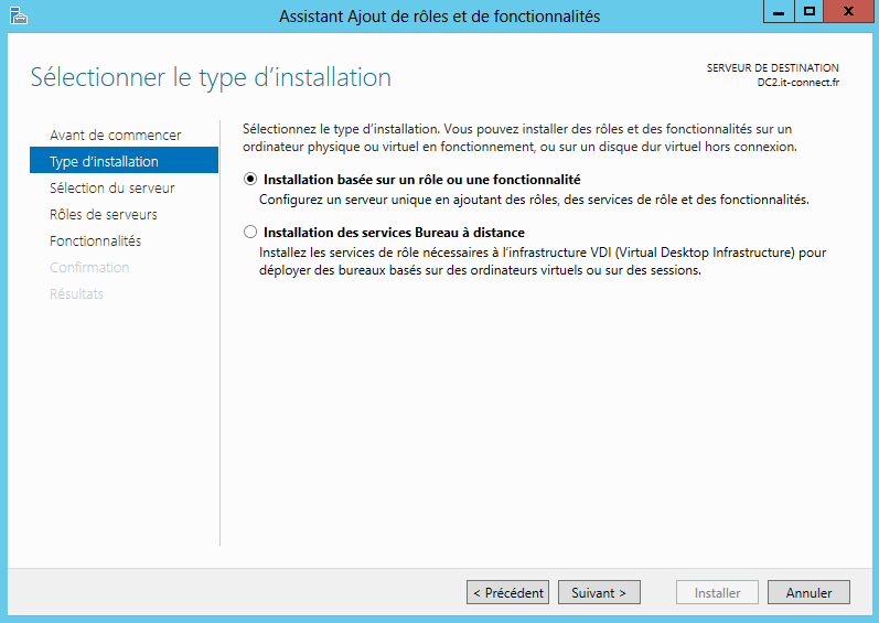 L'assistant s'exécute, cliquez sur "Suivant". Ensuite cliquez sur "Installation basée sur un rôle ou une fonctionnalité" puisque nous souhaitons installer des rôles et fonctionnalités puis cliquez sur "Suivant".
