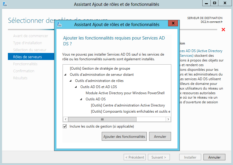 Il faut désormais choisir les rôles à installer. Choisissez d'installer "Services AD DS" qui requiert également l'installation de plusieurs outils d'administration de ce rôle. Cliquez sur "Ajouter des fonctionnalités" puis sur "Suivant".