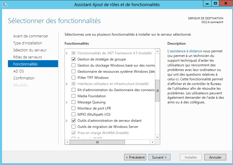 Ensuite, on vous propose d'installer des rôles, laissez les deux cochés par défaut qui sont "Gestion de stratégie de groupe" et "Outils d'administration de serveur distant". Cliquez sur "Suivant".
