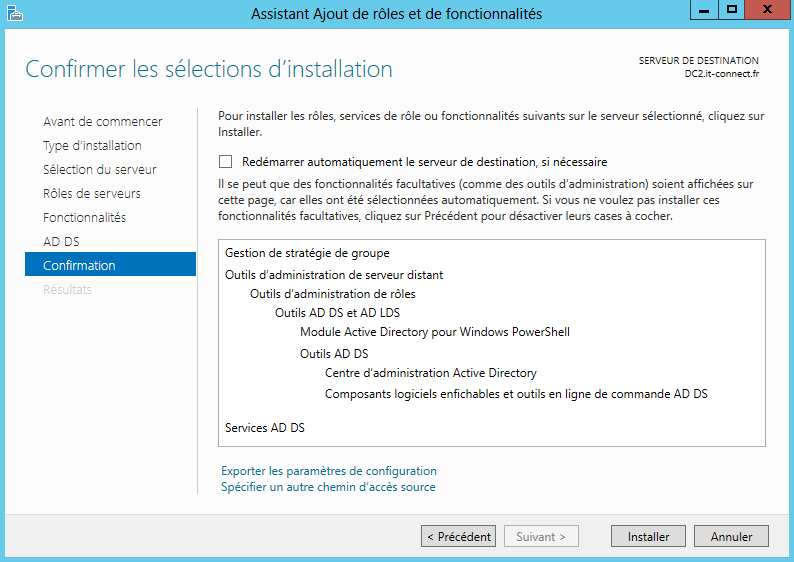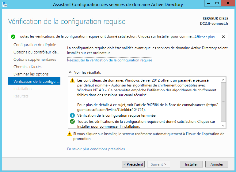 Lisez les quelques indications fournies par l'assistant puis cliquez sur "Installer" pour promouvoir le serveur en tant que contrôleur de domaine au sein du domaine existant. Le serveur va redémarrer automatiquement à la fin du processus d'installation.