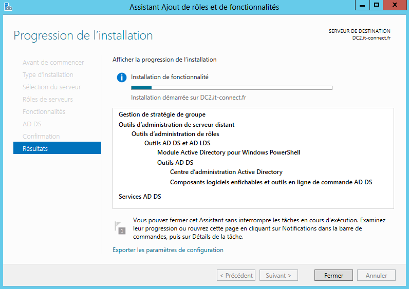Patientez quelques minutes pendant l'installation... Sachez que vous pouvez fermer l'assistant sans pour autant quitter l'installation, ceci étant une nouveauté de Windows Server 2012.