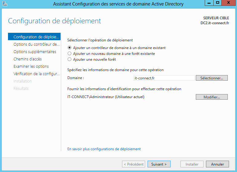 Comme le serveur est déjà membre du domaine "it-connect.fr", l'assistant en déduit astucieusement que nous voulons "Ajouter un contrôleur de domaine à un domaine existant". Laissez ce choix. Vous pouvez changer la partie identification pour indiquer un compte Administrateur du domaine mais cela n'est pas utile si vous êtes déjà connecté avec la session Administrateur du domaine sur le serveur.