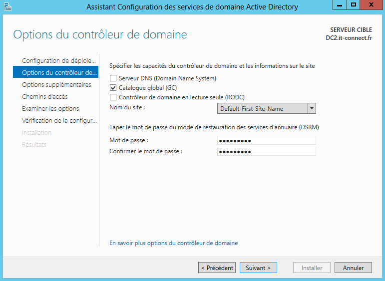 Si vous souhaitez que ce serveur soit "Catalogue Global" cochez la case. Pareillement, si vous souhaitez qu'il soit "RoDC" cochez la case. Enfin, indiquez un mot de passe complexe pour le mode de restauration et poursuivez.