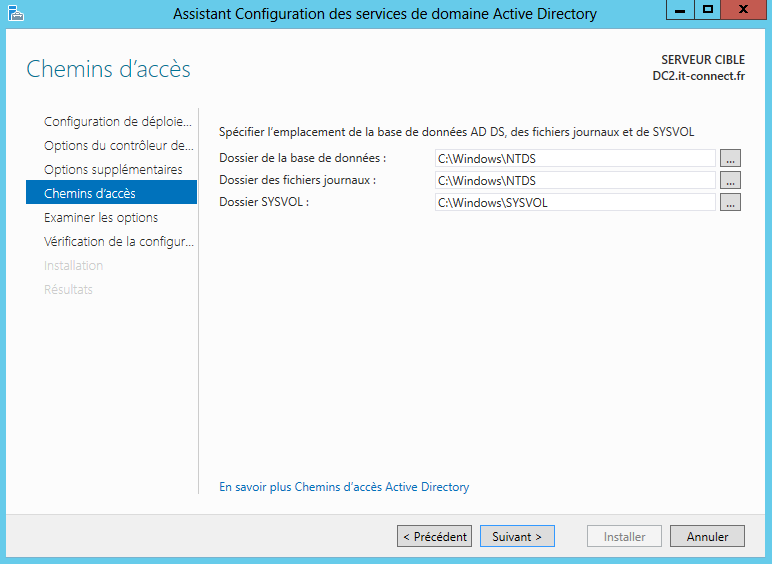 En ce qui concerne les chemins d'accès par défaut aux répertoires utilisés par le service AD DS et ses dépendances, je vous conseille de ne pas les modifier. Cliquez sur "Suivant".