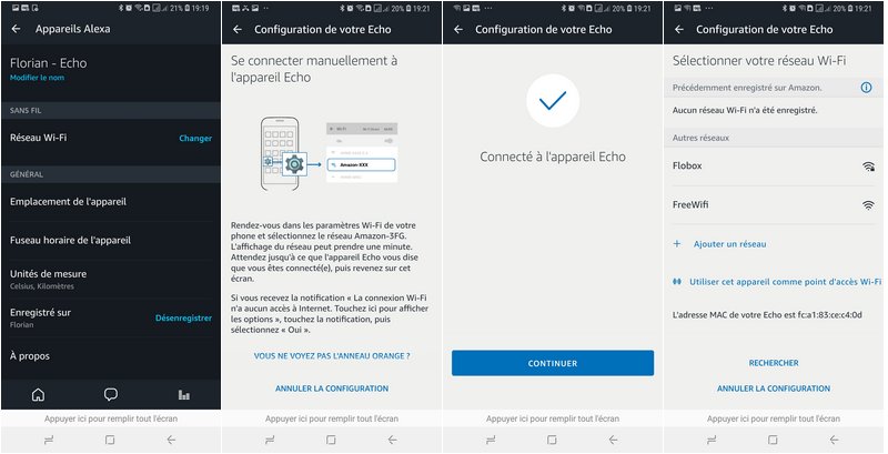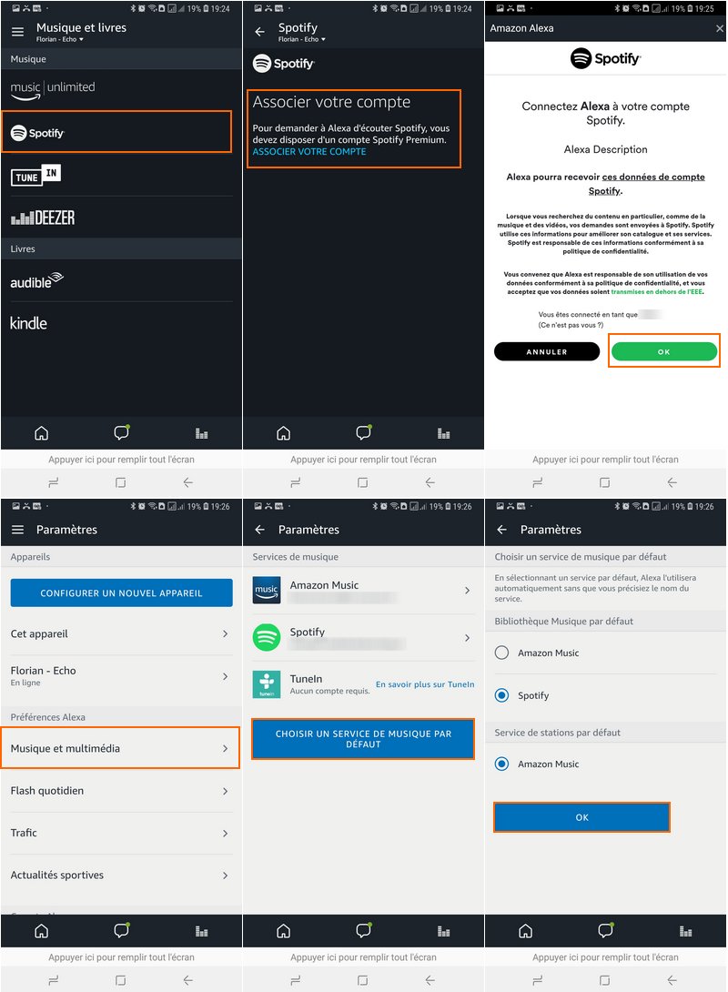 L'association à un compte Spotify s'effectue très facilement. Il est à noter qu'ensuite lorsque vous serai à votre domicile, vous pourrez démarrer la musique depuis votre smartphone et utiliser l'Echo comme enceinte (elle s'affichera dans la liste des appareils disponibles).