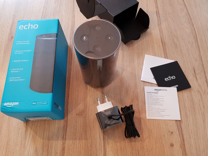 Dans la boîte de l'enceinte connectée, on retrouve l'Amazon Echo, son alimentation et un guide qui contient notamment les choses à essayer, avec des exemples de questions et de demandes à lui soumettre.