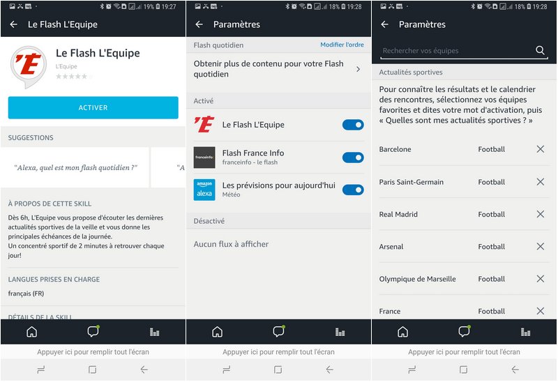 La météo est directement donnée par Alexa en fonction de la localisation définie dans l'application. Pour le flash l'Equipe par exemple, il s'agit du flash l'équipe de 2 minutes que l'on retrouve tous les jours sur le site et qui est diffusé à l'identique, voici un exemple : Flash l'Equipe