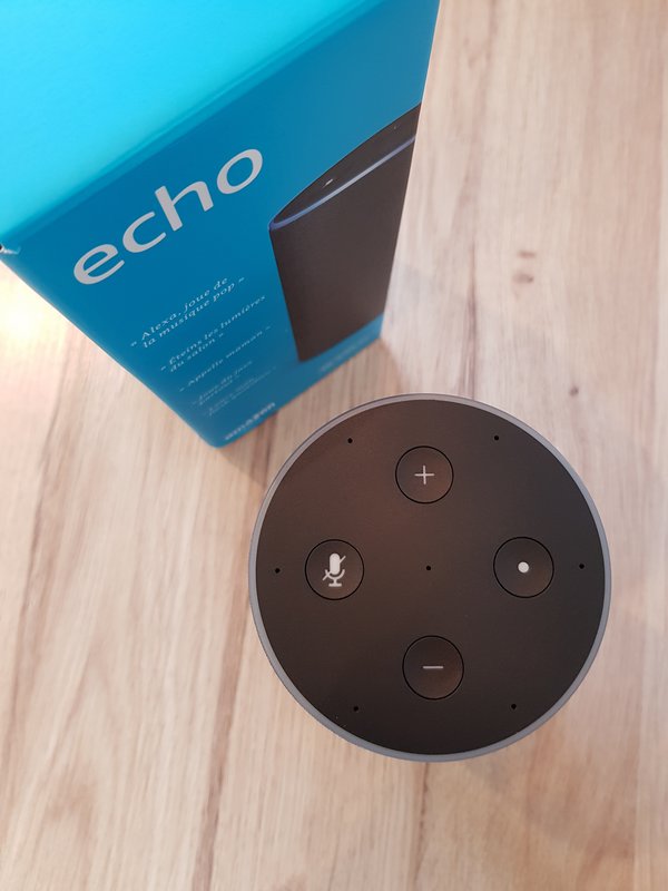 Sur le dessus de l'Amazon Echo, on retrouve 4 boutons, qui permettent d'augmenter ou de diminuer le volume, de désactiver le microphone et un autre bouton d'action.