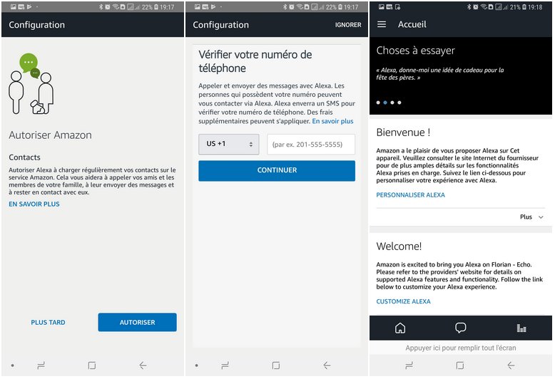 L'application vous propose ensuite d'autoriser l'accès à vos contacts à Amazon, et d'indiquer votre numéro de téléphone, ce qui vous permettra d'appeler vos contacts (Alexa uniquement) en le demandant à votre enceinte connectée.