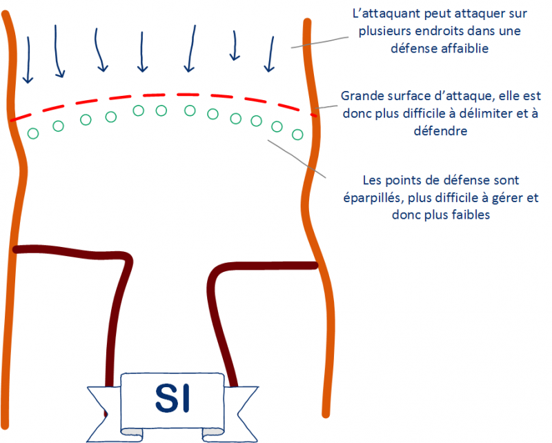 Dans le cas où la surface n'est pas réduite, où elle n'a pas subi d'analyse et de correction comme c'est le cas dans beaucoup de SI, on se retrouve avec une grande surface d'attaque. Alors, la défense et les moyens de filtrage et de contrôle sont plus complexes à mettre en place et à organiser. Une attaque de surface de grande taille se caractérise par de nombreux points d'entrée sur le système d'information, ainsi, un attaquant aura de nombreuses possibilités d'attaque et de chances supplémentaires d'y trouver une vulnérabilité pour atteindre le SI. Dans le film 300, cette stratégie aurait pu être adoptée, mais les Spartiates n'auraient pas survécu bien longtemps en raison de leur infériorité numérique. Voyons maintenant le schéma qui illustre une surface d'attaque réduite et contrôlée :