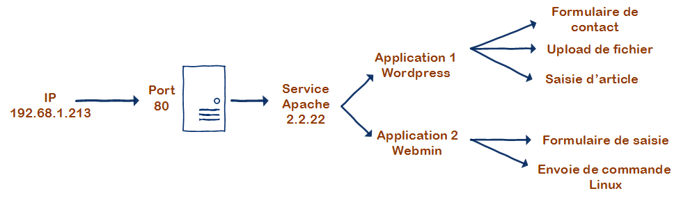 Ici, l'analyse de la surface d'attaque commence par le point d'entrée qui est l'IP et le port de la machine. Il ne faut ici pas oublier l'OS du serveur qui peut déjà contenir des vulnérabilités. Sur ce point d'entrée tourne un service Apache2 qui peut lui aussi être attaqué, sur ce serveur Apache2, deux applications distinctes qui peuvent aussi contenir leurs propres vulnérabilités et qui contiennent des points d'entrée supplémentaires, sur un service web il peut par exemple s'agir de possibilité d'uploader des fichiers, de saisir du texte stocké sur le serveur, ou de la possibilité de faire des recherches... Chacun de ces points est une partie de la surface d'attaque.