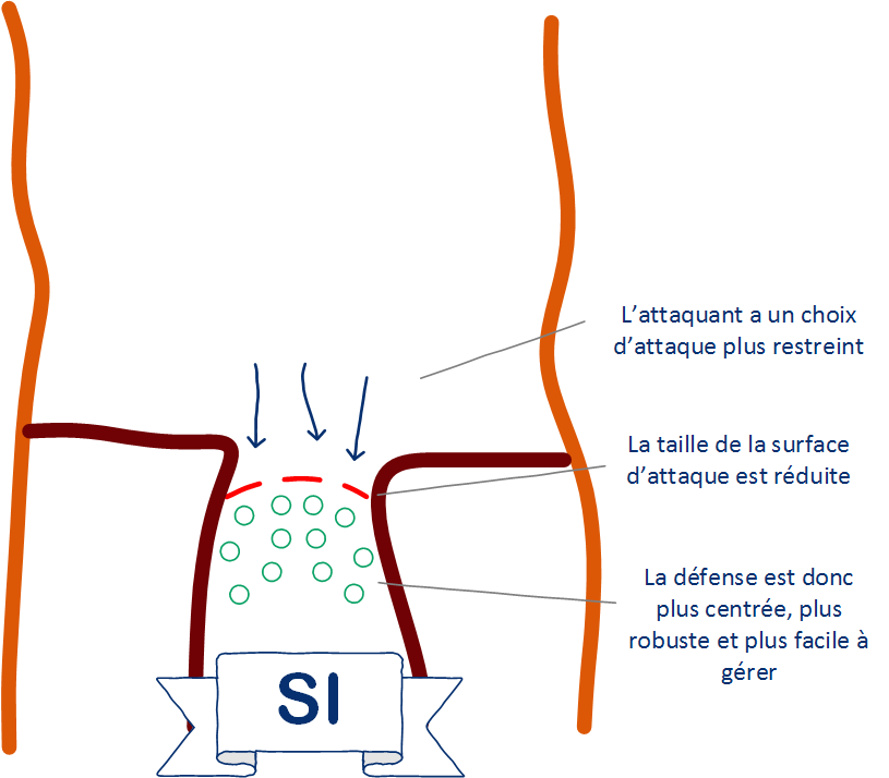Dans ce cas, la surface d'attaque est contrôlée et réduite, on se retrouve donc avec une quantité moins importante de points d'entrée. L'attaquant a donc moins de possibilités d'attaque et moins de chances de trouver une porte d'entrée vulnérable sur le SI. De plus, les points de défense, de filtrage et de contrôle couvrent une zone moins importante et sont donc plus faciles à gérer et au final, plus efficaces. Il faut également noter que si la surface d'attaque est plus petite et mieux définie, les points de défenses peuvent être moins nombreux, cela signifie donc moins de main-d’œuvre pour les mettre en place, mais également moins d'achats de logiciels et matériels de protection comme des routeurs ou des modules de filtrage.