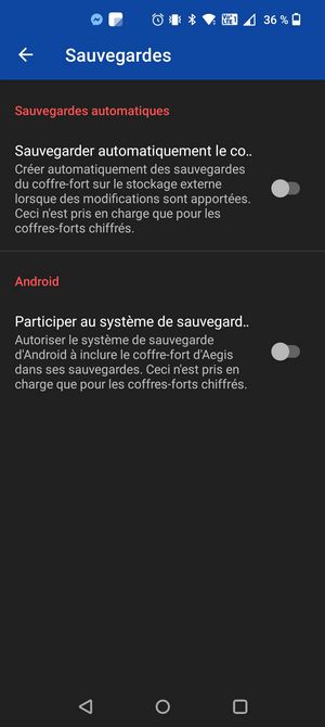 Les identifiants contenus dans le coffre-fort d'Aegis sont chiffrés (AES-256), et pour accéder à son contenu, il faut saisir son mot de passe maître ou scanner son empreinte biométrique. C'est à la fois sécurisé et pratique. Lorsque vous utilisez un coffre-fort chiffré (et uniquement dans ce cas), il est possible d'en créer des sauvegardes automatiques sur le stockage de votre smartphone.