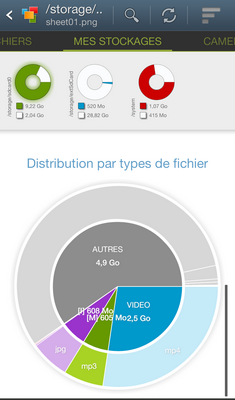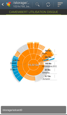 Ce qui est intéressant, c'est la section "Camembert utilisation disque" accessible en faisant glisser le doigt de la droite vers la gauche sur l'écran. Vous obtiendrez une vue en camembert de l'utilisation du disque pour le répertoire en cours, ensuite si vous cliquez sur une portion du camembert, vous obtiendrez en détails l'utilisation de cette portion. Cela reprend le principe des logiciels du même type disponible sous Windows et Linux (et sûrement sur Mac OS ?)