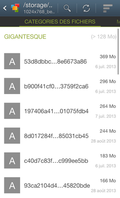 Ensuite, L'icône en forme de graphique en bâtons situé en haut à droite de l'application vous permet de faire différents tris, vous pourrez consulter la liste des fichiers stockés sur votre appareil en triant par taille, selon différentes catégories de taille. Par exemple, les fichiers "Gigantesques" c'est à dire supérieurs à 128 Mo.