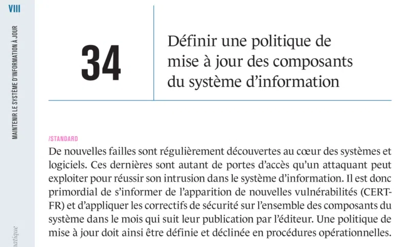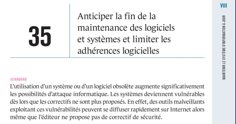 Toujours concernant le guide d’hygiène de l’ANSSI, sa directive n°35 concerne justement l’anticipation de l’obsolescence des logiciels et systèmes :