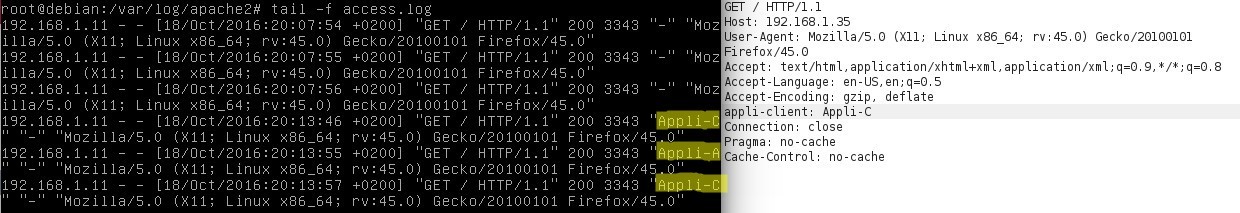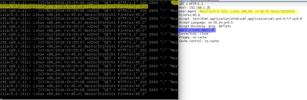 A droite, nous voyons en en détail ma requête HTTP et ses headers. A gauche, nous voyons les logs Apache correspondant. Nous voyons alors bien le contenu du header "User-Agent", mais pas celui des autres headers et notamment du header "appli-client".