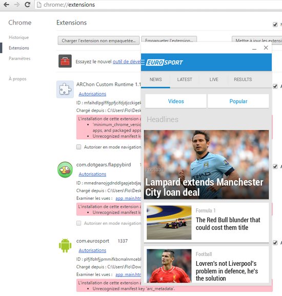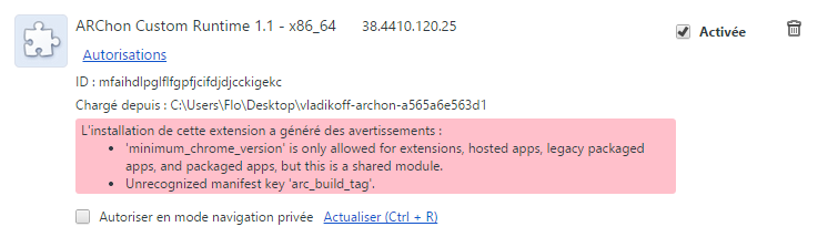 L'extension ARChon Custom Runtime 1.1 est bien installée au sein de Chrome.