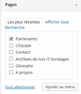 On va alors ajouter une simple page (peu importe son nom, il ne sera pas affiché) en la cochant puis en cliquant sur "Ajouter au menu" :