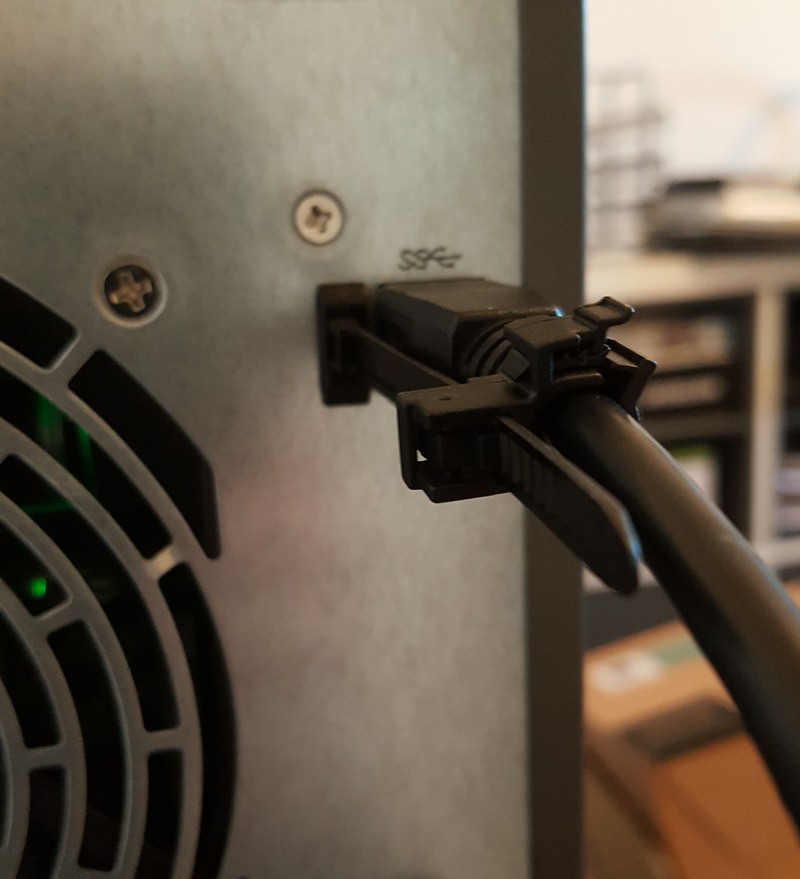 Le système de verrouillage pour le câble USB est très important, car il permet d'éviter que le câble USB se déconnecte de l'unité d'expansion. Ceci est indispensable, car couper la liaison entre l'unité d'expansion et le NAS, c'est comme retirer en même temps plusieurs disques durs du NAS.