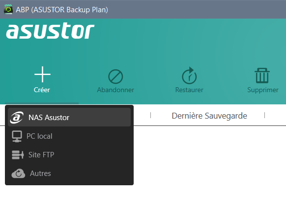 Je vous propose de démarrer le logiciel, et ensuite de cliquer sur "Créer" puis "NAS Asustor". Ceci va permettre de créer un job de sauvegarde en utilisant un NAS Asustor comme destination.