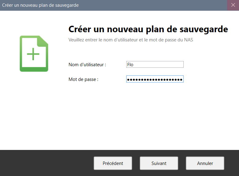 Vous devez ensuite indiquer le compte à utiliser pour s'authentifier sur le NAS, notamment pour réaliser la sauvegarde.