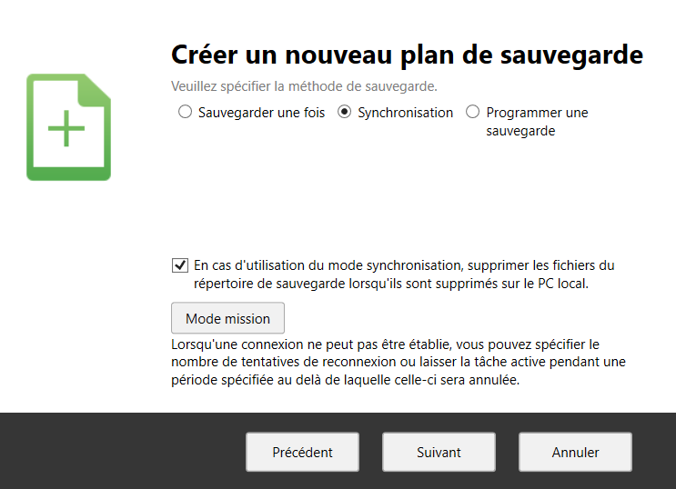 Pour ma part, je souhaite réaliser une synchronisation afin d'avoir une copie unique et à jour de mon profil utilisateur sur le NAS. Je sélectionne donc "Synchronisation" et je coche l'option "En cas d'utilisation du mode synchronisation..." afin que la synchronisation fonctionne en mode miroir.