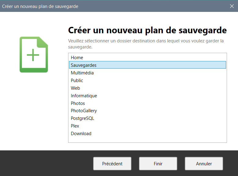 Après avoir sélectionné la source, il faut indiquer la destination, ce sera "Sauvegardes" dans mon cas. Il s'agit d'un partage créé au préalable sur le NAS.