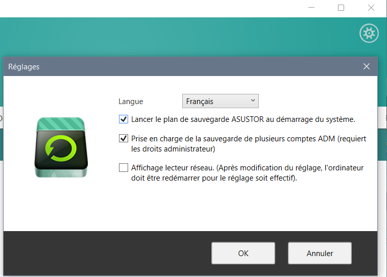 Cliquez ensuite sur "Finir" pour valider la création du job de sauvegarde. Pour être sur que vos jobs s'exécutent, je vous recommande d'accéder au paramétrage de l'application : en cliquant sur l'icône en haut à droite et cochez l'option "Lancer le plan de sauvegarde ASUSTOR au démarrage du système" pour démarrer l'application automatiquement.